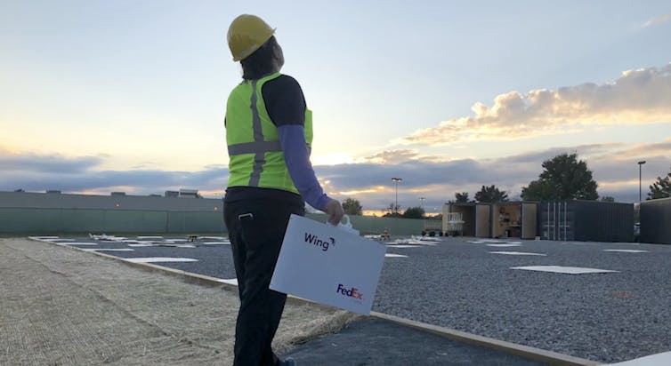 A worker waits to attach a delivery to a drone. Wing