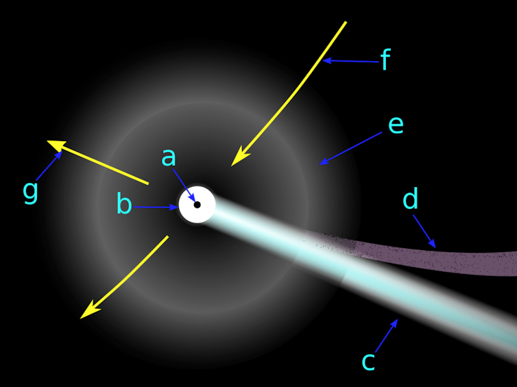 As comets swing closer to the Sun, they heat up, and their surface ices sublime (turn from a solid to a gas). Erupting from the comet’s surface, this gas carries along dust, shrouding the nucleus in what’s called a coma – a giant cloud of gas and dust. The coma is then pushed away from the Sun by solar wind, resulting in a tail (or tails) pointing directly away from the Sun.